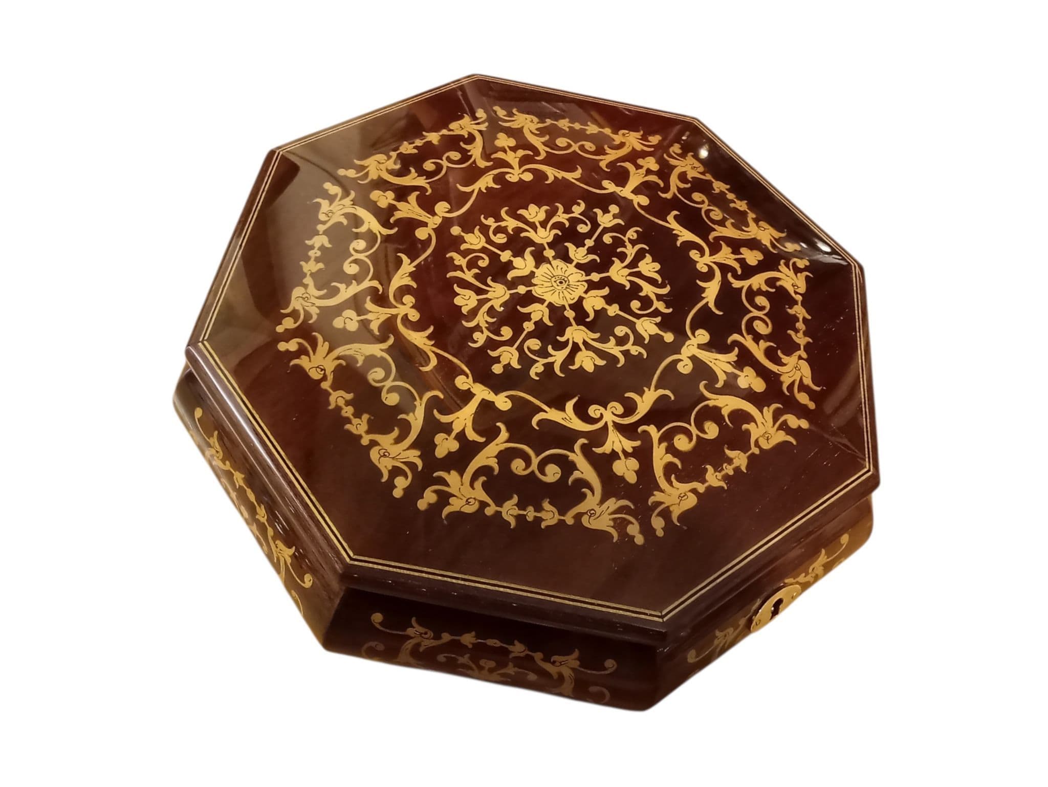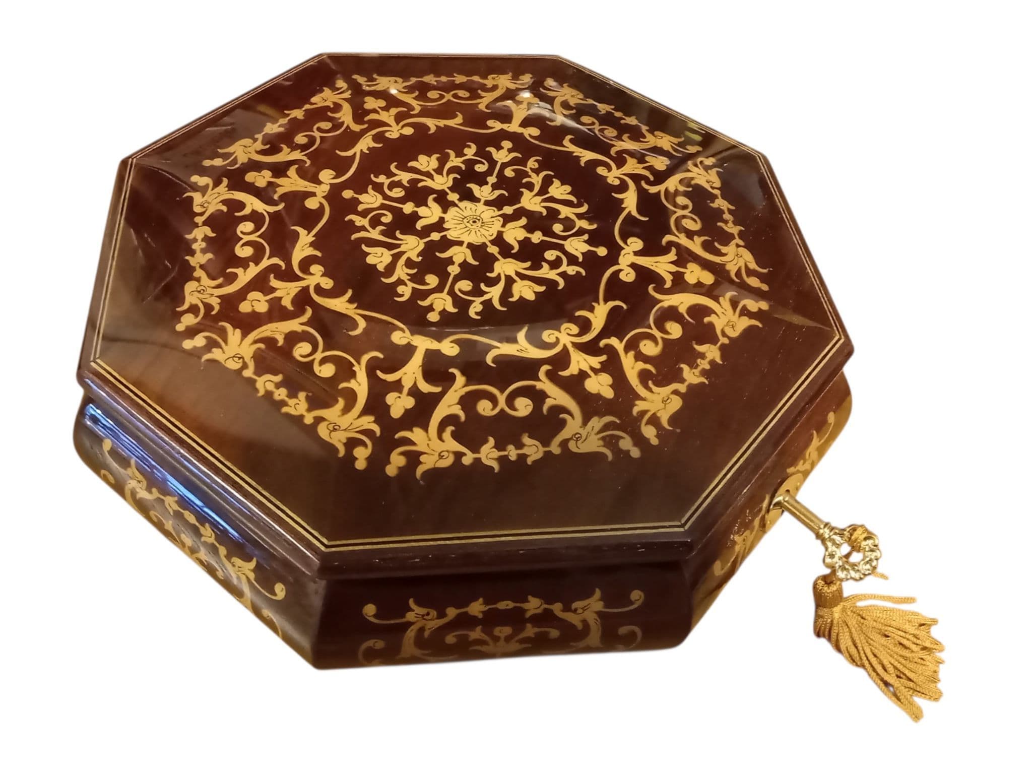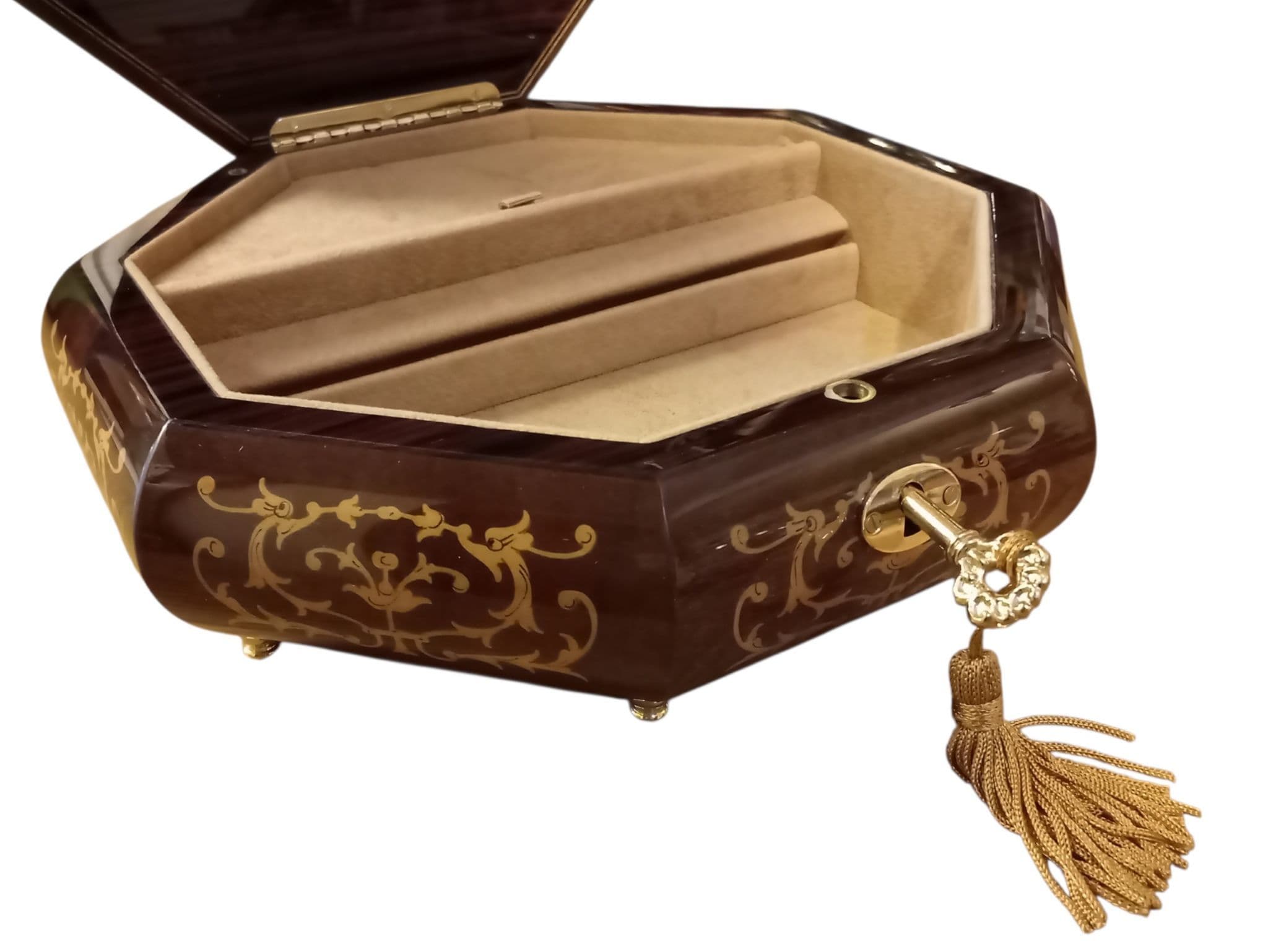 There is a lift out cover over the musical movement so that the musical movement can be on display beneath perspex if required. This music box also has a lock fitted and is supplied with a decorative key with a gold coloured tassle. The music box sits on eight delicate brass feet.
