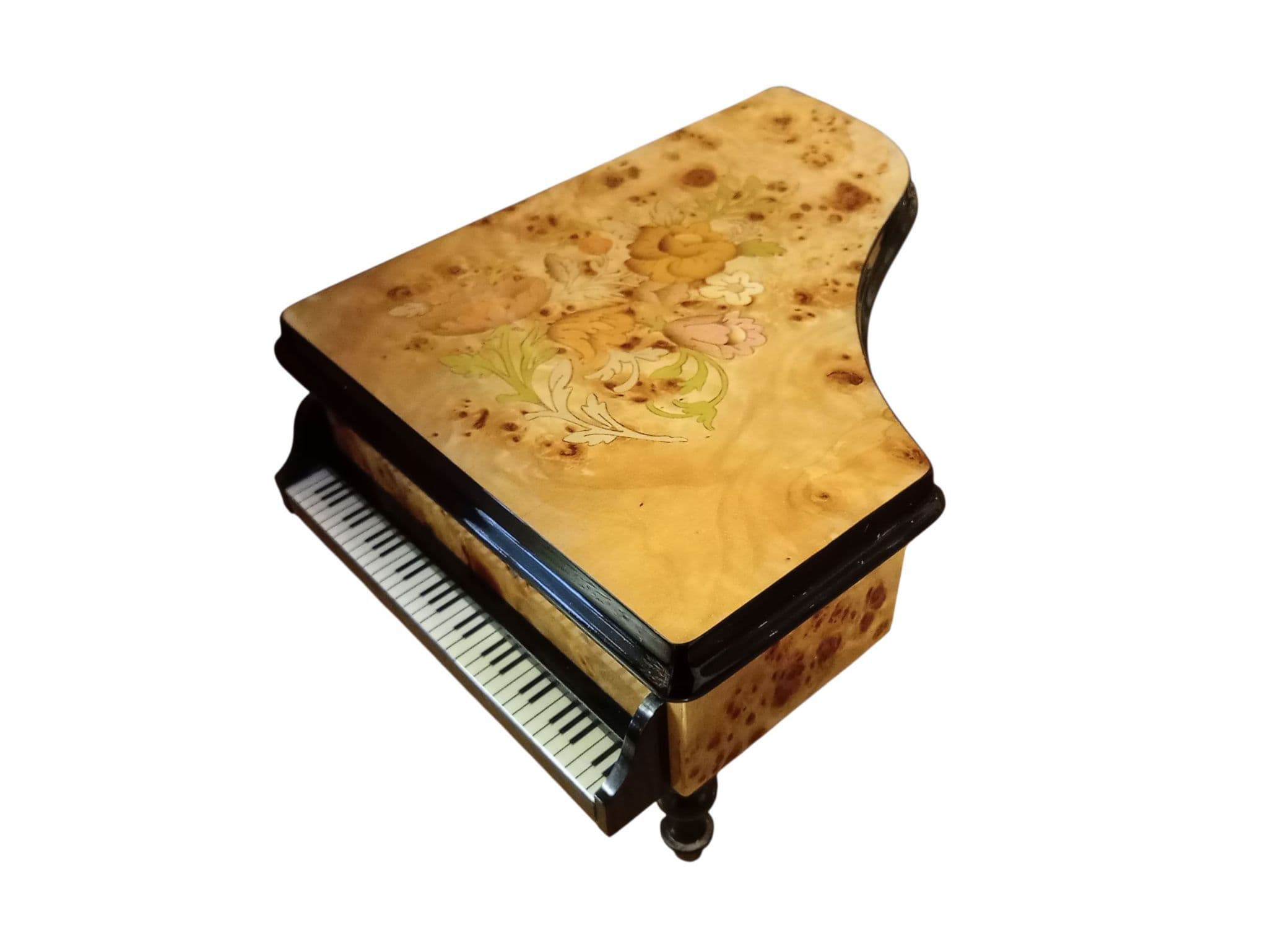 This is a beautiful miniature grand piano that has been fitted with an 18 note clockwork musical movement. The piano is finished in a high gloss elm veneer with a hand crafted floral inlay. The piano lid can be lifted and propped open so that the inside can be viewed and this feature activates the musical movement to play. The musical movement is wound by a key beneath the piano. You can select a choice of tune from the list marked as 'Select A Tune'.