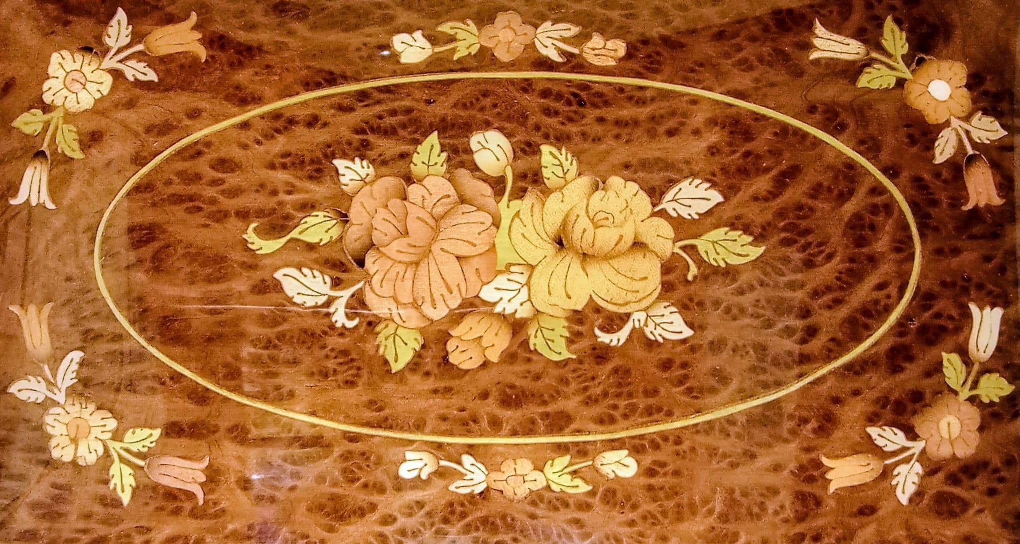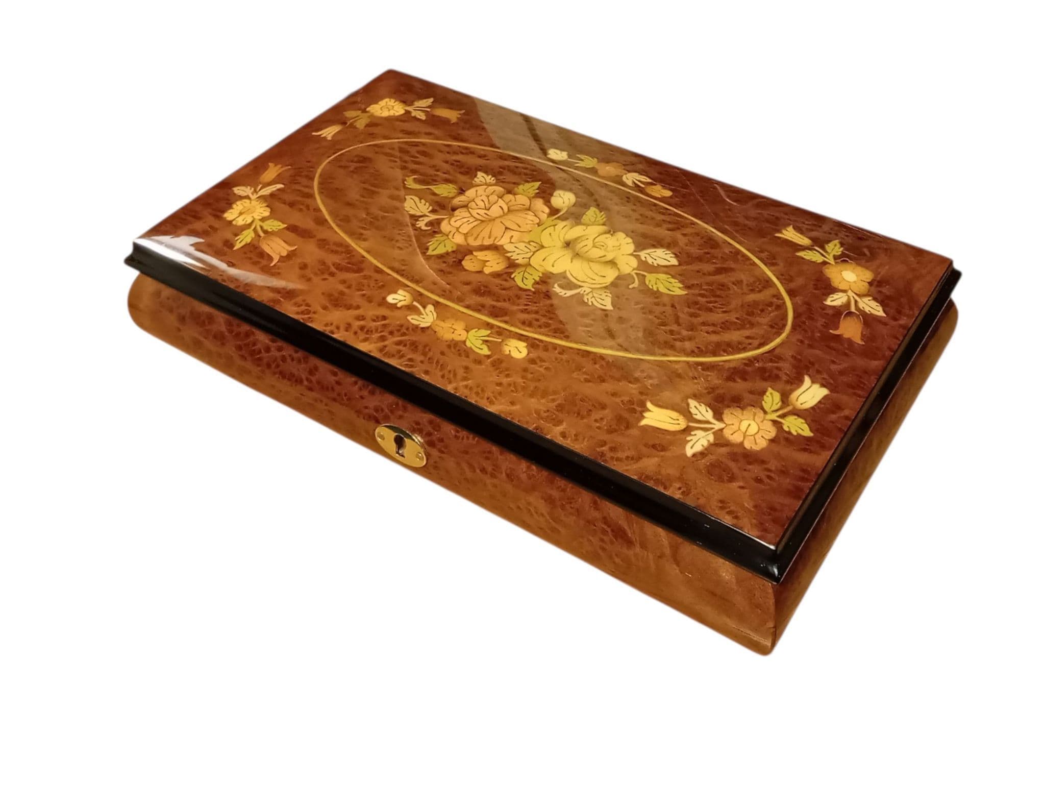 This Italian wooden musical jewellery box is finished with an elm veneer and inlaid with marquetry flowers in a classical style. The finish is a high gloss lacquer. The music box is wound from underneath. When you lift the lid the music plays. An 18 note musical movement is fitted inside this box. There is a lock at the front of the box.