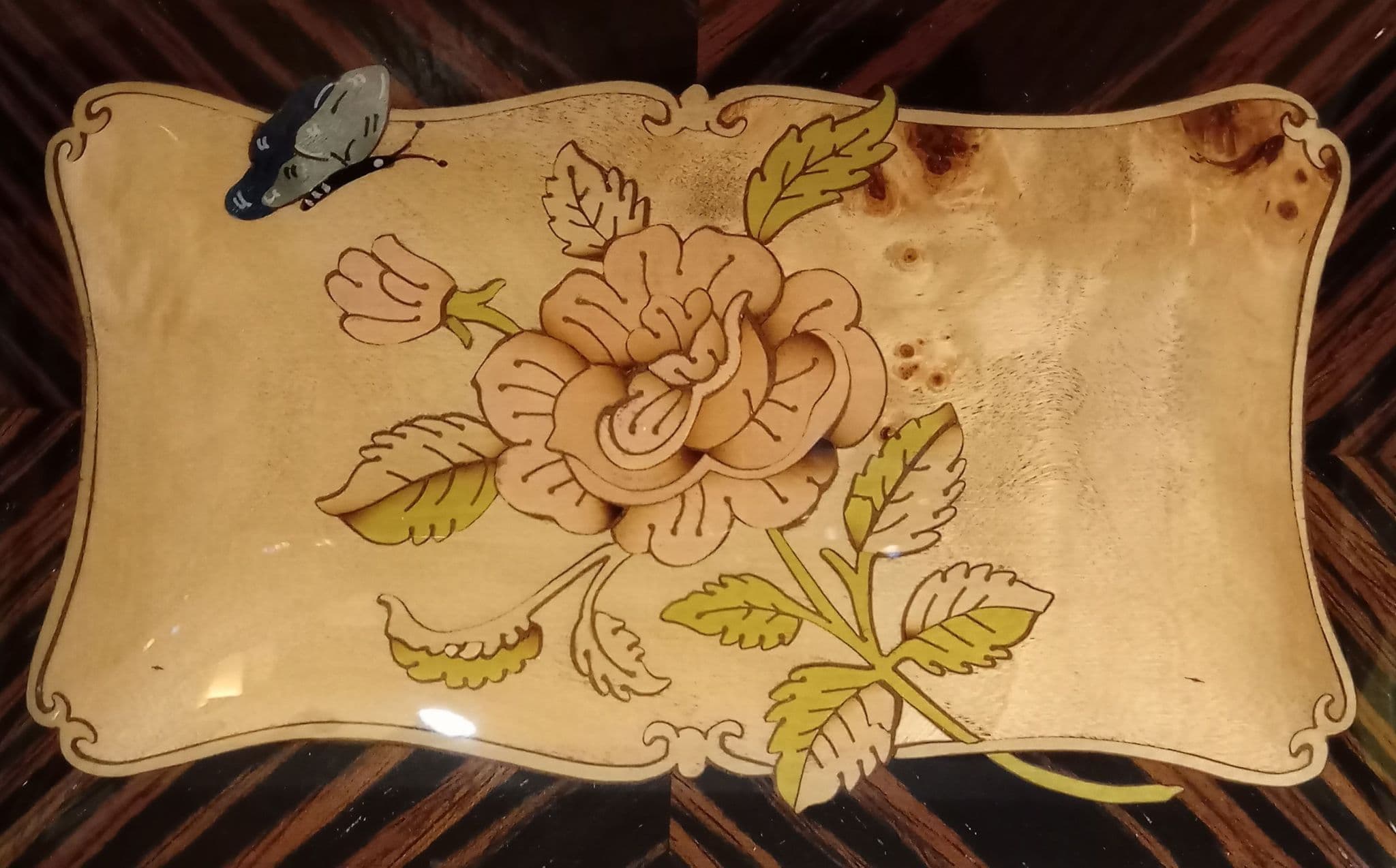 This fine wooden musical jewellery box is hand made, finished in a pioppo (poplar) veneer and coated in a gloss lacquer. The marquetry set into the lid is of a beautiful rose and butterfly design. The interior is lined in a light brown baize and there is a padded slot for rings and some space for small chains and earrings.